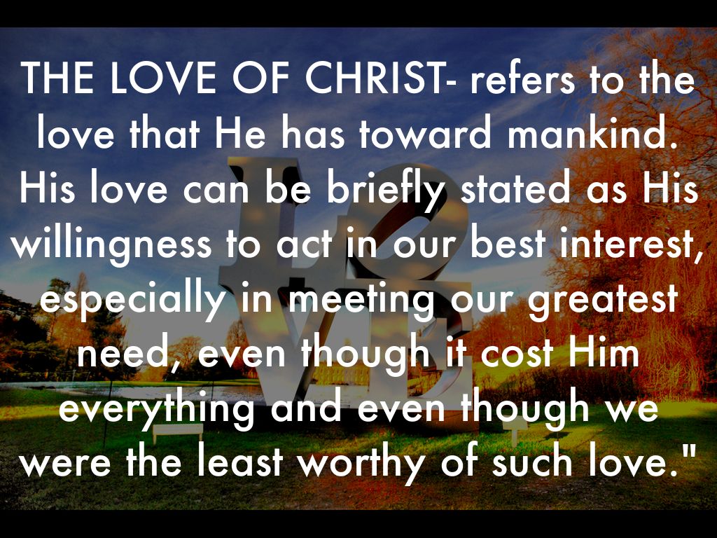 THE LOVE OF CHRIST- refers to the love that He has toward mankind. His love can be briefly stated as His willingness to act in our best interest, especially in meeting our greatest need, even though it cost Him everything and even though we were the least worthy of such love."