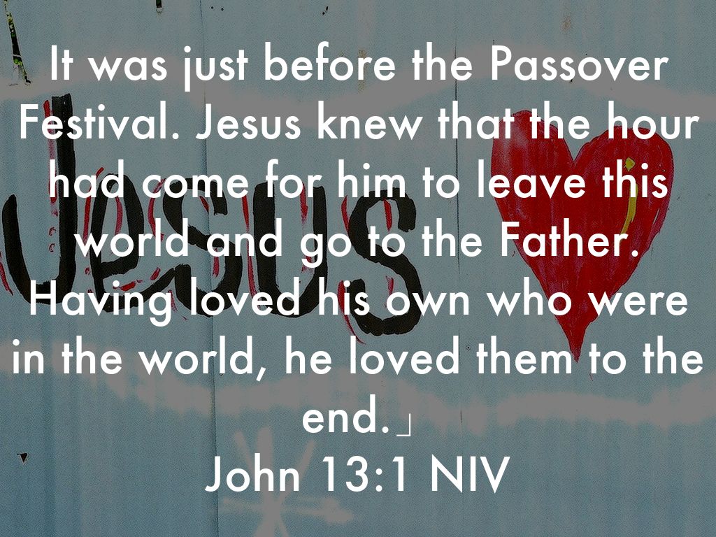 It was just before the Passover Festival. Jesus knew that the hour had come for him to leave this world and go to the Father. Having loved his own who were in the world, he loved them to the end.」 John 13:1 NIV
