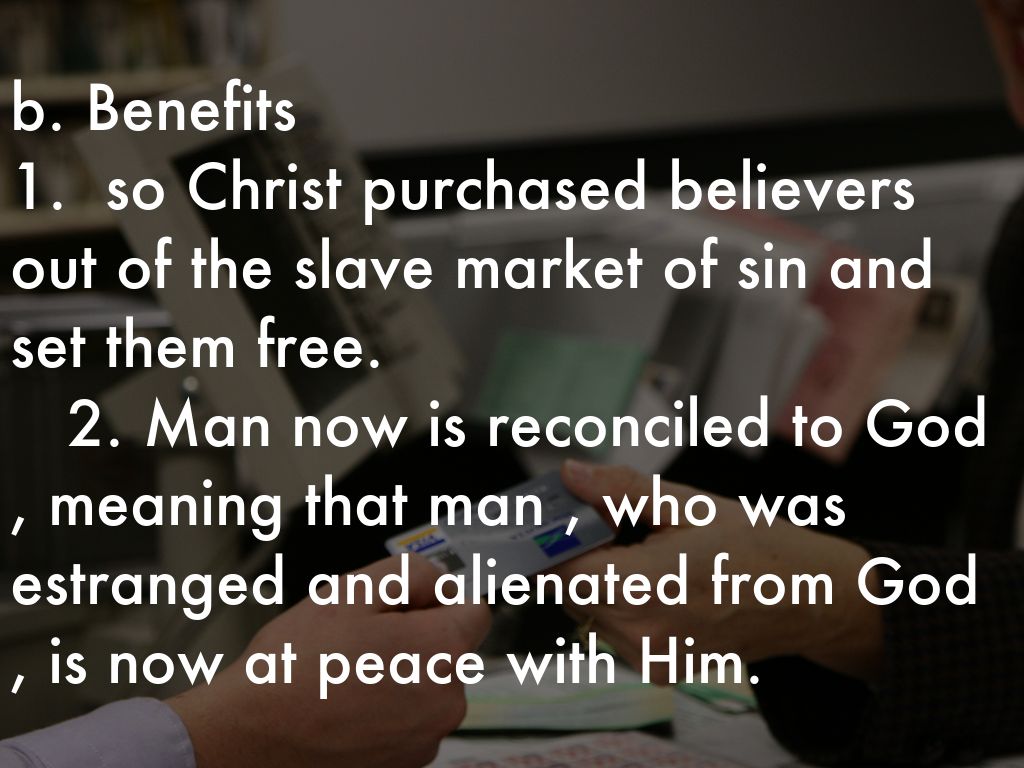 b. Benefits 1. so Christ purchased believers out of the slave market of sin and set them free. 2. Man now is reconciled to God , meaning that man , who was estranged and alienated from God , is now at peace with Him.