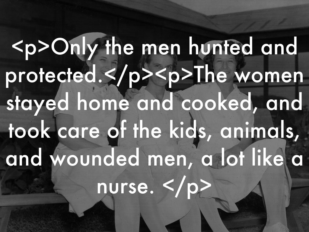 The women stayed home and cooked, and took care of the kids, animals, and wounded men, a lot like a nurse.