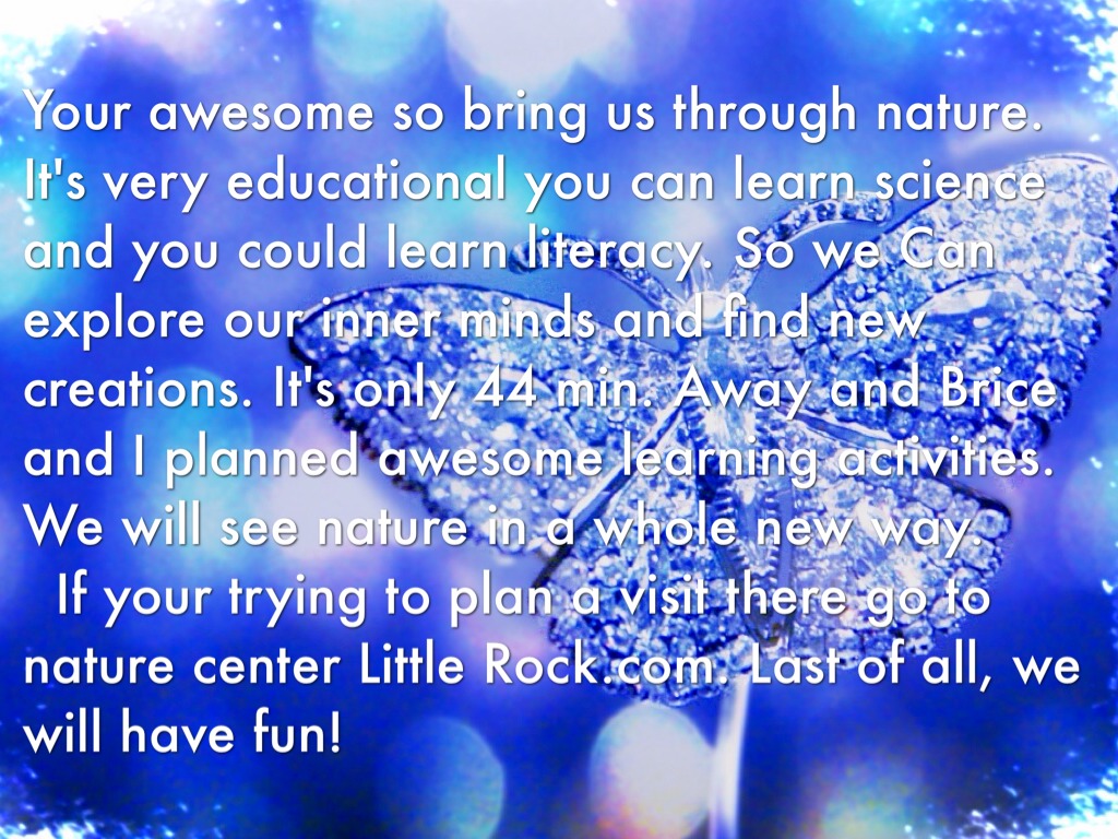 Your awesome so bring us through nature. It's very educational you can learn science and you could learn literacy. So we Can explore our inner minds and find new creations. It's only 44 min. Away and Brice and I planned awesome learning activities. We will see nature in a whole new way. If your trying to plan a visit there go to nature center Little Rock.com. Last of all, we will have fun!