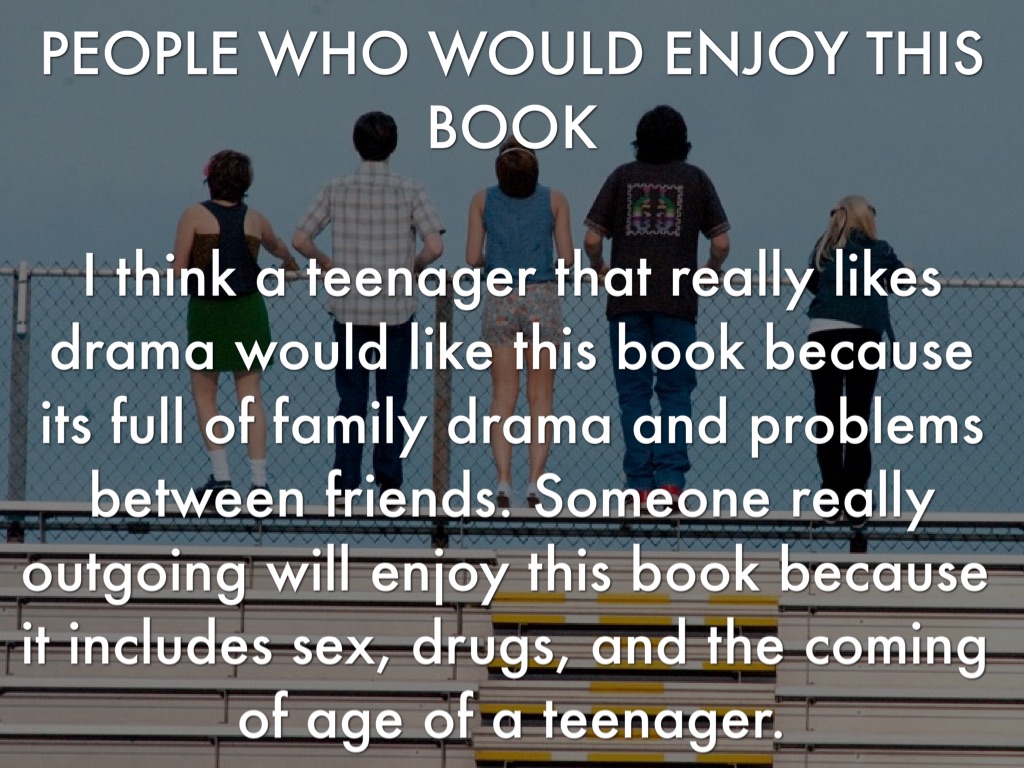 I think a teenager that really likes drama would like this book because its full of family drama and problems between friends. Someone really outgoing will enjoy this book because it includes sex, drugs, and the coming of age of a teenager.