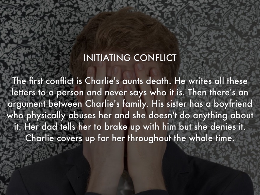 The first conflict is Charlie's aunts death. He writes all these letters to a person and never says who it is. Then there's an argument between Charlie's family. His sister has a boyfriend who physically abuses her and she doesn't do anything about it. Her dad tells her to brake up with him but she denies it. Charlie covers up for her throughout the whole time.
