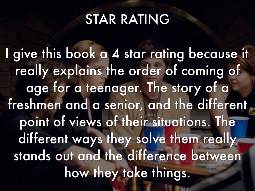 I give this book a 4 star rating because it really explains the order of coming of age for a teenager. The story of a freshmen and a senior, and the different point of views of their situations. The different ways they solve them really stands out and the difference between how they take things.