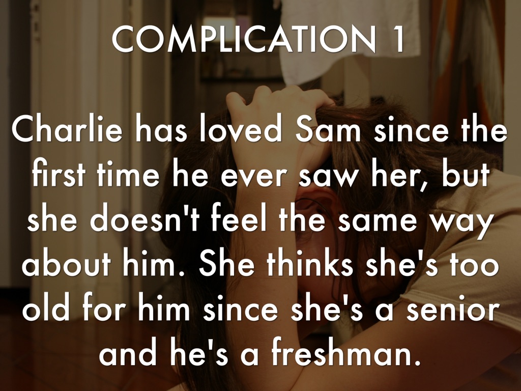Charlie has loved Sam since the first time he ever saw her, but she doesn't feel the same way about him. She thinks she's too old for him since she's a senior and he's a freshman.