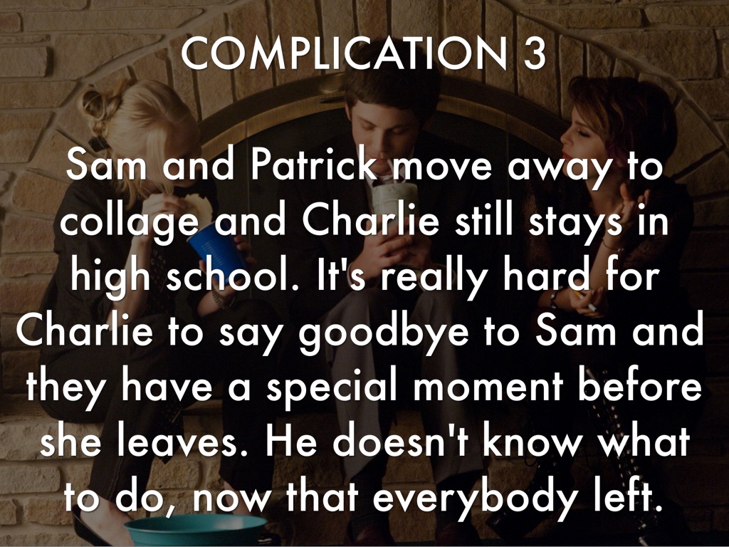 Sam and Patrick move away to collage and Charlie still stays in high school. It's really hard for Charlie to say goodbye to Sam and they have a special moment before she leaves. He doesn't know what to do, now that everybody left.