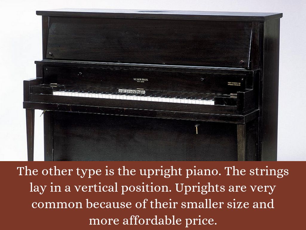 The other type is the upright piano. The strings lay in a vertical position. Uprights are very common because of their smaller size and more affordable price.