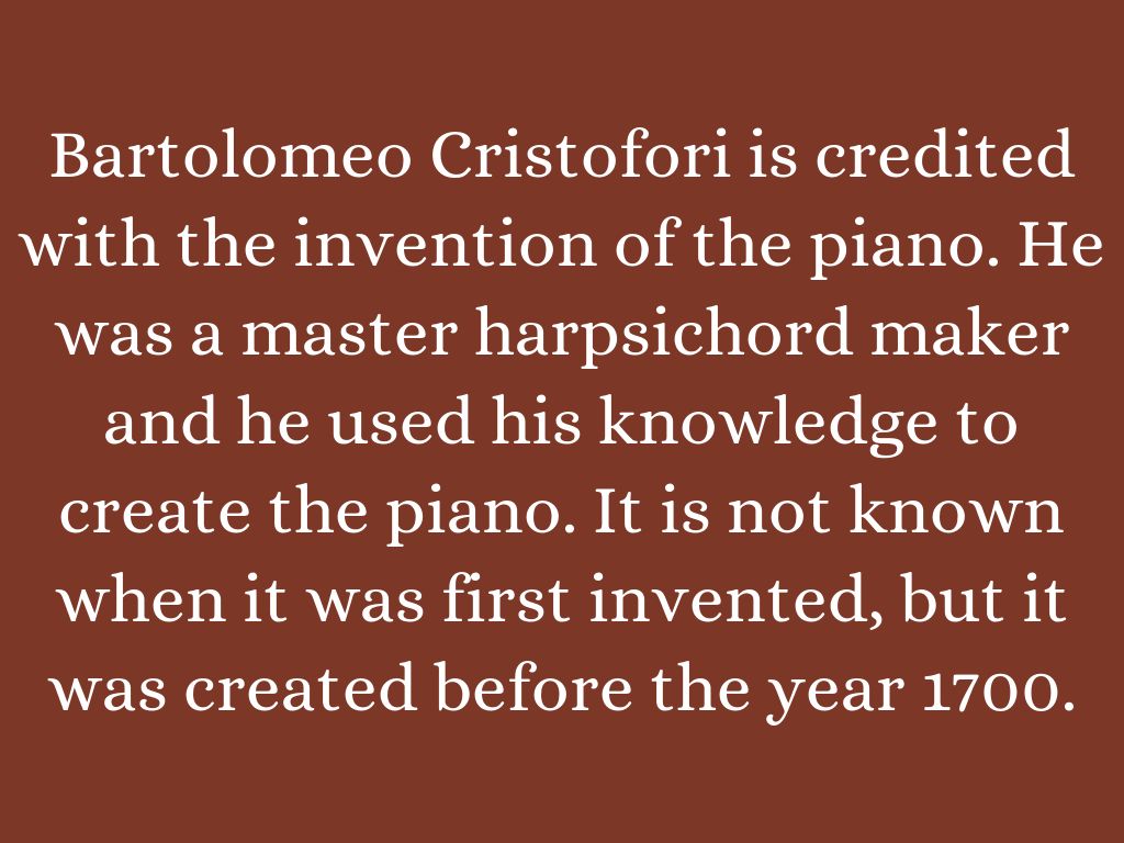 Bartolomeo Cristofori is credited with the invention of the piano. He was a master harpsichord maker and he used his knowledge to create the piano. It is not known when it was first invented, but it was created before the year 1700.