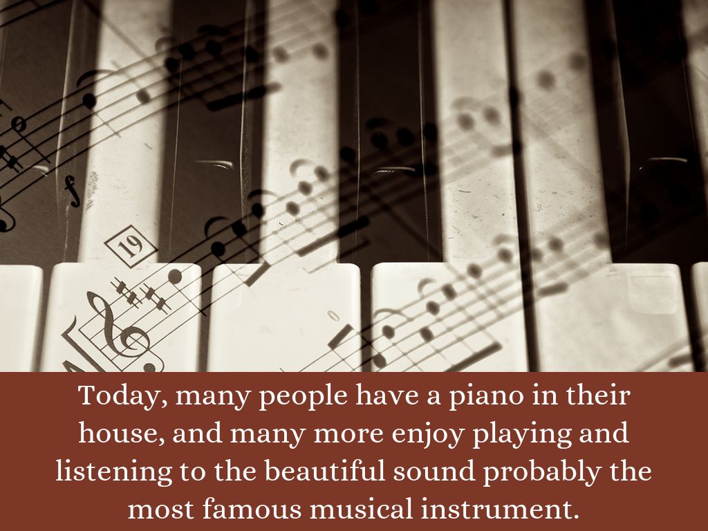 Today, many people have a piano in their house, and many more enjoy playing and listening to the beautiful sound probably the most famous musical instrument.