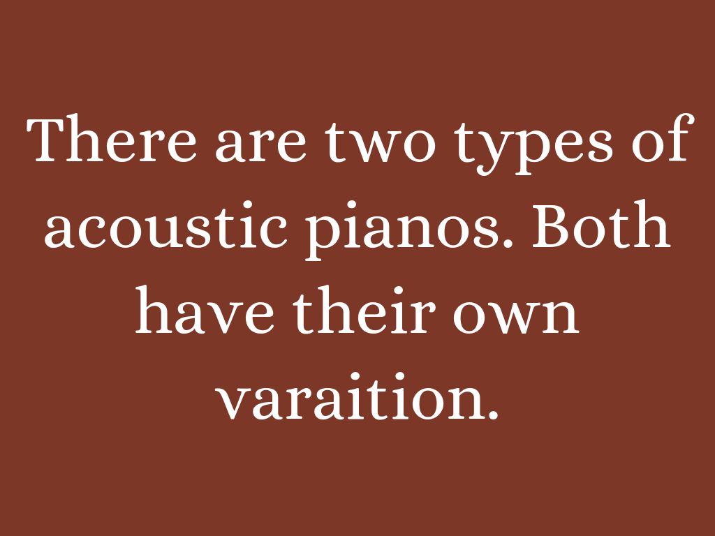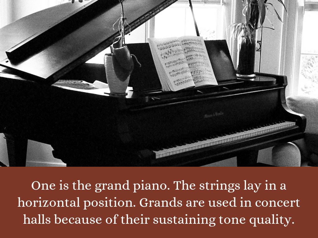 One is the grand piano. The strings lay in a horizontal position. Grands are used in concert halls because of their sustaining tone quality.