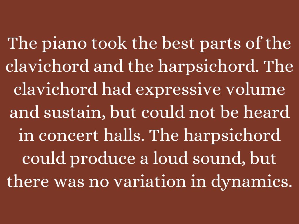 The piano took the best parts of the clavichord and the harpsichord. The clavichord had expressive volume and sustain, but could not be heard in concert halls. The harpsichord could produce a loud sound, but there was no variation in dynamics.