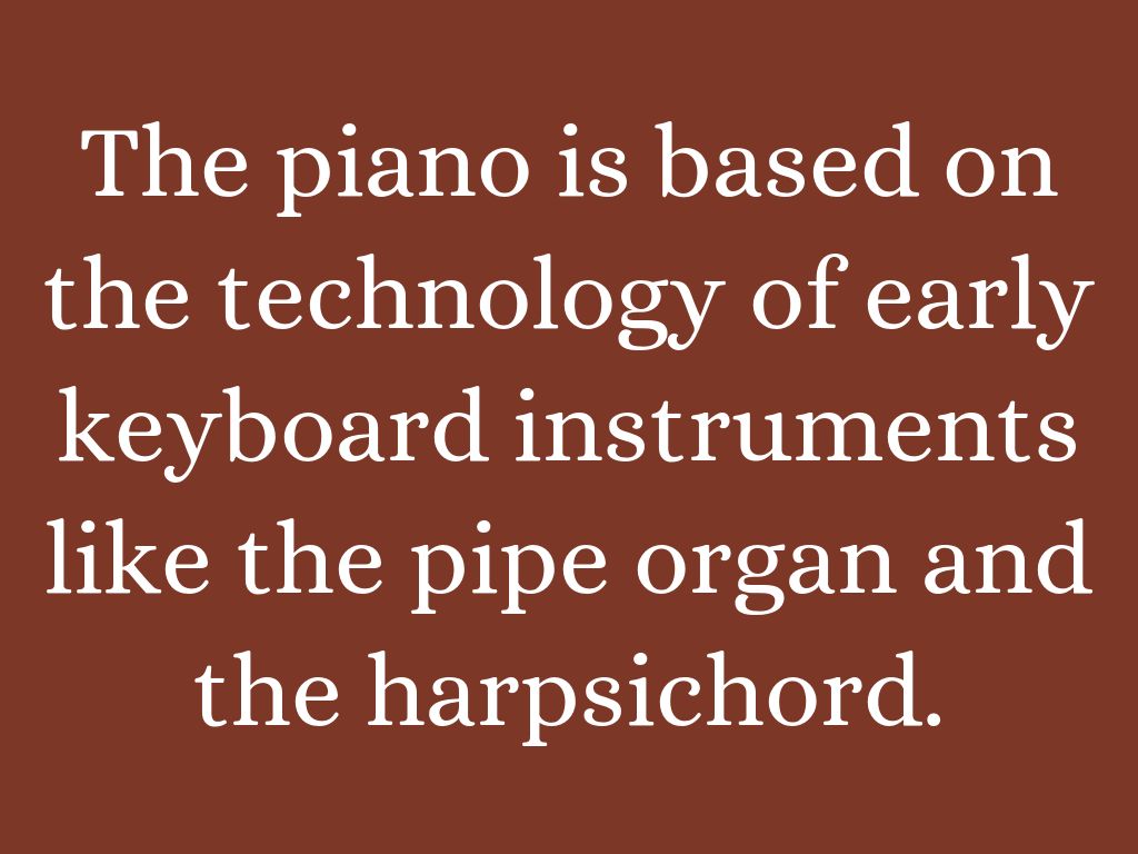 The piano is based on the technology of early keyboard instruments like the pipe organ and the harpsichord.