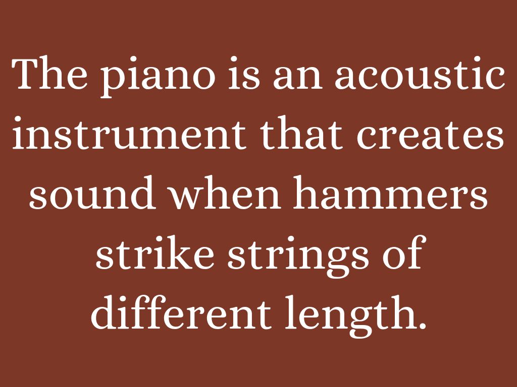 The piano is an acoustic instrument that creates sound when hammers strike strings of different length.
