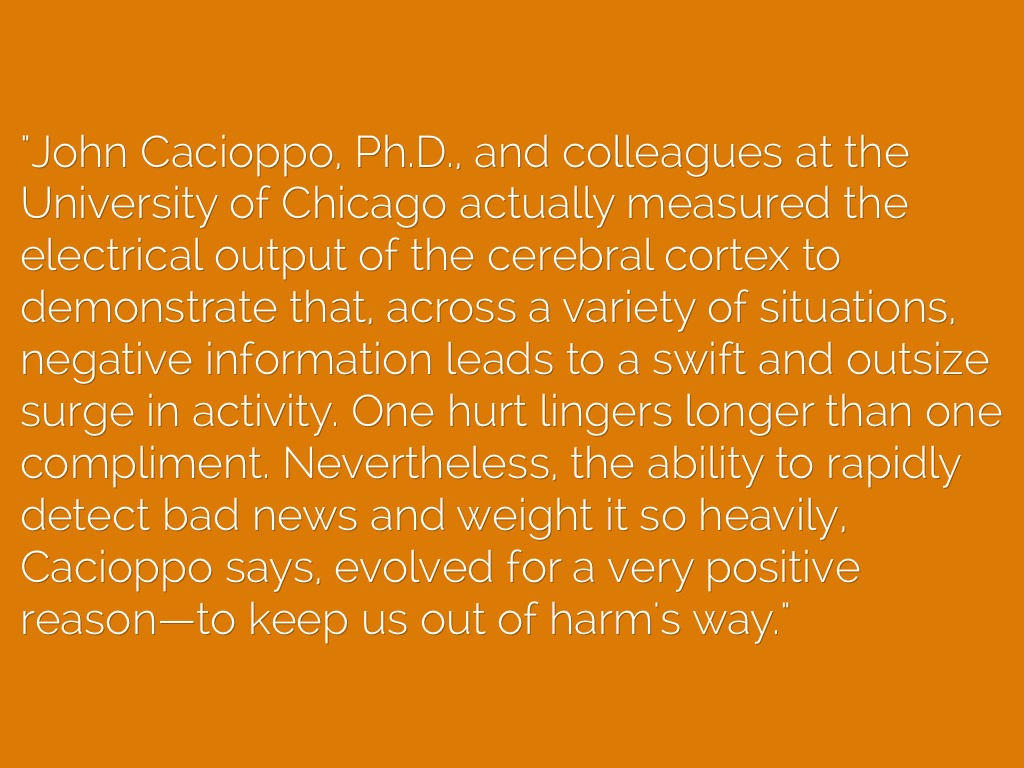 "John Cacioppo, Ph.D., and colleagues at the University of Chicago actually measured the electrical output of the cerebral cortex to demonstrate that, across a variety of situations, negative information leads to a swift and outsize surge in activity. One hurt lingers longer than one compliment. Nevertheless, the ability to rapidly detect bad news and weight it so heavily, Cacioppo says, evolved for a very positive reason—to keep us out of harm's way."