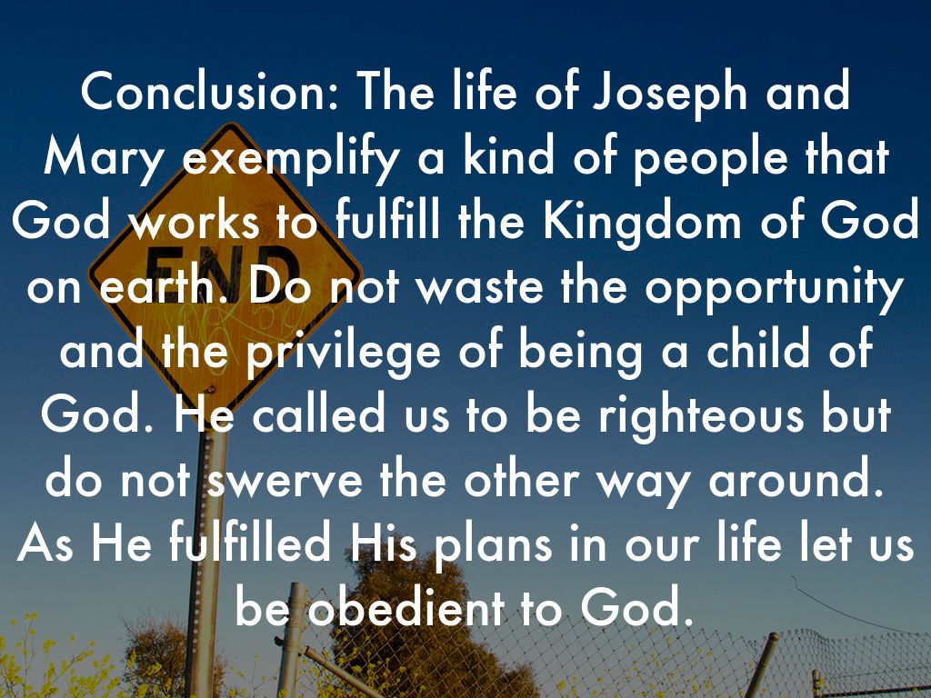 Conclusion: The life of Joseph and Mary exemplify a kind of people that God works to fulfill the Kingdom of God on earth. Do not waste the opportunity and the privilege of being a child of God. He called us to be righteous but do not swerve the other way around. As He fulfilled His plans in our life let us be obedient to God.