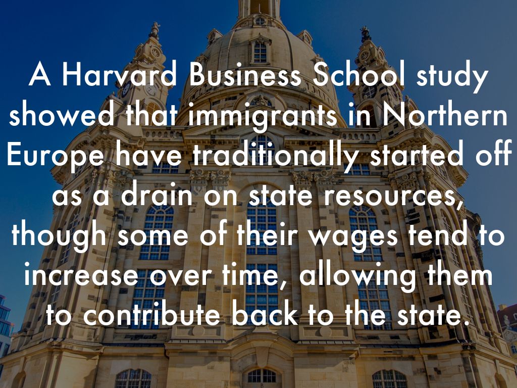 A Harvard Business School study showed that immigrants in Northern Europe have traditionally started off as a drain on state resources, though some of their wages tend to increase over time, allowing them to contribute back to the state.