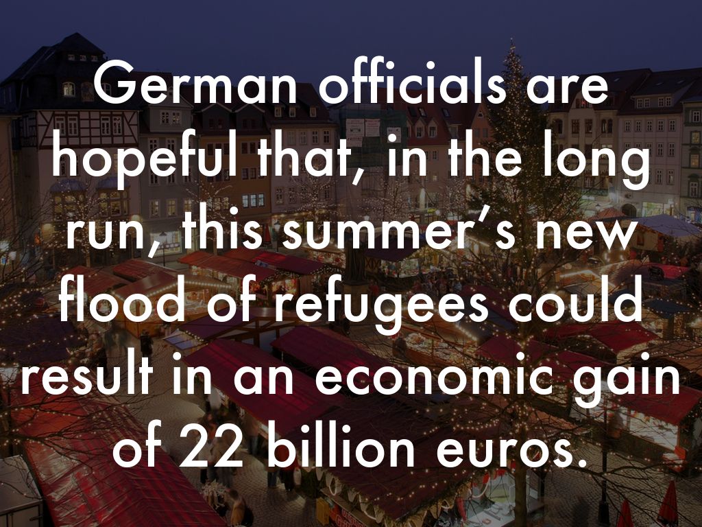German officials are hopeful that, in the long run, this summer’s new flood of refugees could result in an economic gain of 22 billion euros.