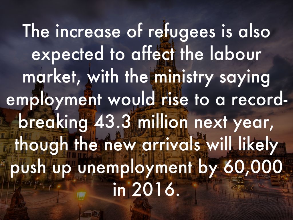 The increase of refugees is also expected to affect the labour market, with the ministry saying employment would rise to a record-breaking 43.3 million next year, though the new arrivals will likely push up unemployment by 60,000 in 2016.