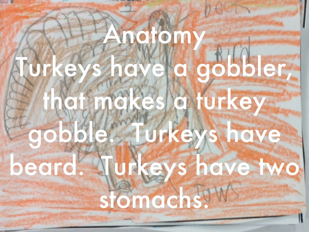 Turkeys have a gobbler, that makes a turkey gobble. Turkeys have beard. Turkeys have two stomachs.