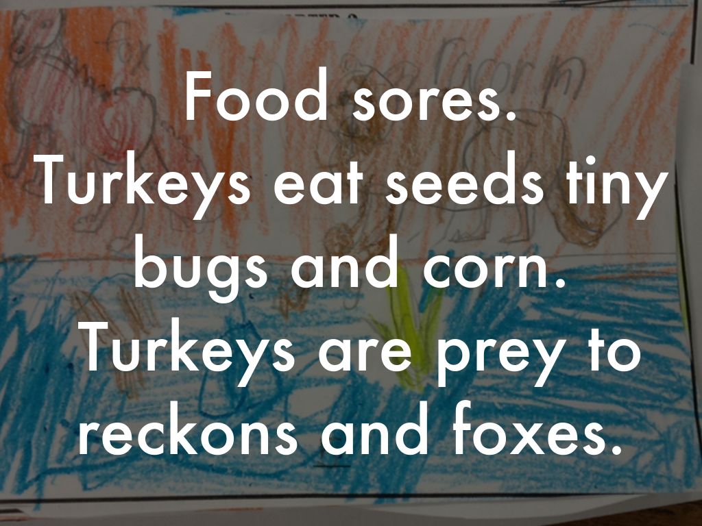 Turkeys eat seeds tiny bugs and corn. Turkeys are prey to reckons and foxes.