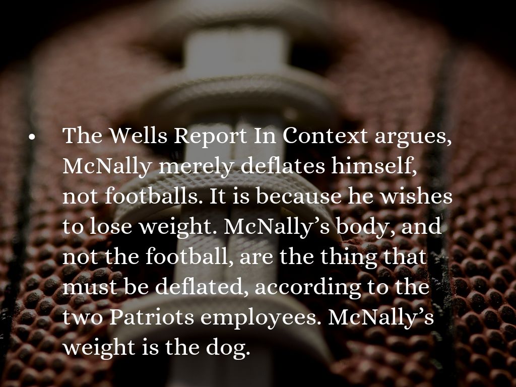 The Wells Report In Context argues, McNally merely deflates himself, not footballs. It is because he wishes to lose weight. McNally’s body, and not the football, are the thing that must be deflated, according to the two Patriots employees. McNally’s weight is the dog.