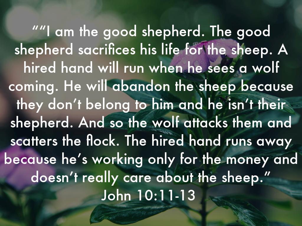 ““I am the good shepherd. The good shepherd sacrifices his life for the sheep. A hired hand will run when he sees a wolf coming. He will abandon the sheep because they don’t belong to him and he isn’t their shepherd. And so the wolf attacks them and scatters the flock. The hired hand runs away because he’s working only for the money and doesn’t really care about the sheep.” John 10:11-13