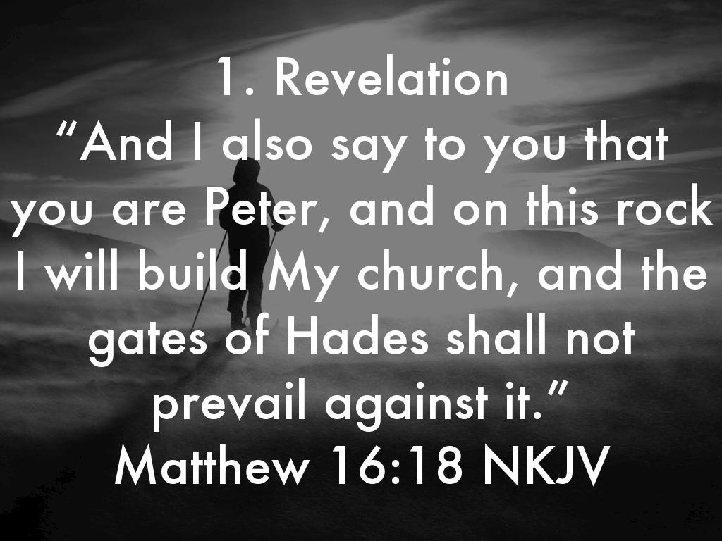 1. Revelation “And I also say to you that you are Peter, and on this rock I will build My church, and the gates of Hades shall not prevail against it.” Matthew 16:18 NKJV