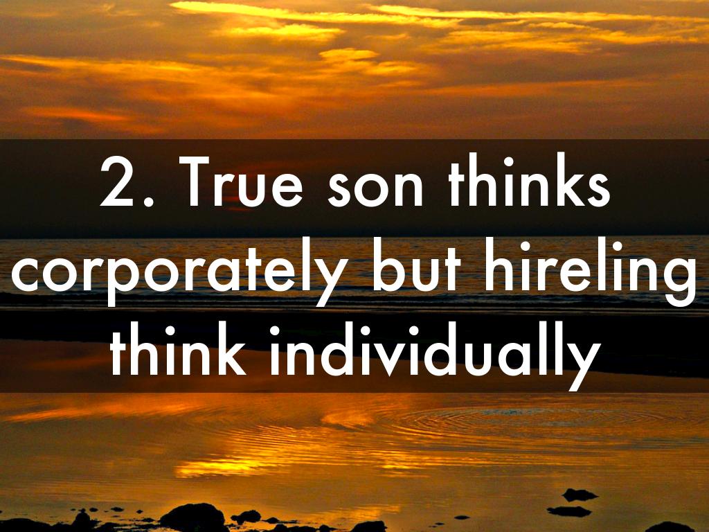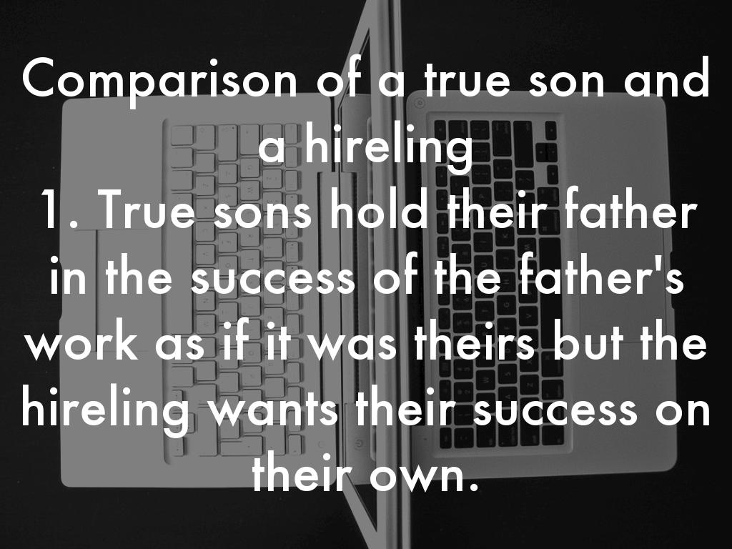 Comparison of a true son and a hireling 1. True sons hold their father in the success of the father's work as if it was theirs but the hireling wants their success on their own.