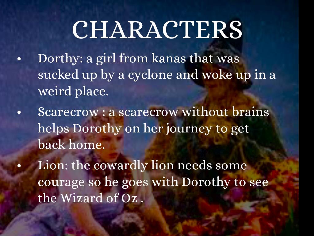 Dorthy: a girl from kanas that was sucked up by a cyclone and woke up in a weird place.