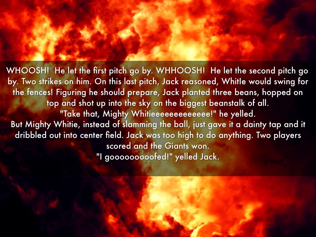 WHOOSH! He let the first pitch go by. WHHOOSH! He let the second pitch go by. Two strikes on him. On this last pitch, Jack reasoned, WhitIe would swing for the fences! Figuring he should prepare, Jack planted three beans, hopped on top and shot up into the sky on the biggest beanstalk of all. "Take that, Mighty Whitieeeeeeeeeeeee!" he yelled. But Mighty Whitie, instead of slamming the ball, just gave it a dainty tap and it dribbled out into center field. Jack was too high to do anything. Two players scored and the Giants won. "I gooooooooofed!" yelled Jack.