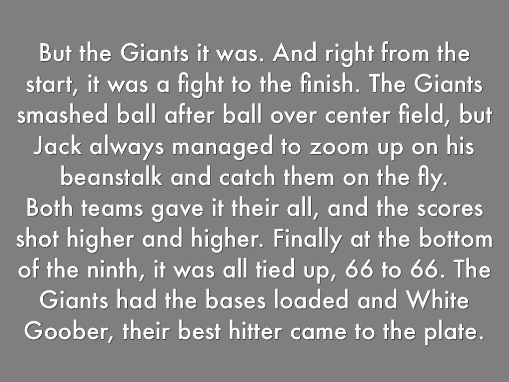 But the Giants it was. And right from the start, it was a fight to the finish. The Giants smashed ball after ball over center field, but Jack always managed to zoom up on his beanstalk and catch them on the fly. Both teams gave it their all, and the scores shot higher and higher. Finally at the bottom of the ninth, it was all tied up, 66 to 66. The Giants had the bases loaded and White Goober, their best hitter came to the plate.