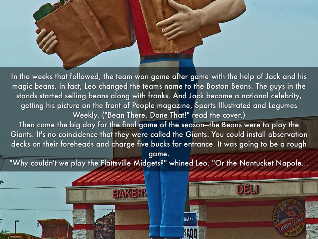 In the weeks that followed, the team won game after game with the help of Jack and his magic beans. In fact, Leo changed the teams name to the Boston Beans. The guys in the stands started selling beans along with franks. And Jack became a national celebrity, getting his picture on the front of People magazine, Sports Illustrated and Legumes Weekly. ("Bean There, Done That!" read the cover.) Then came the big day for the final game of the season---the Beans were to play the Giants. It's no coincidence that they were called the Giants. You could install observation decks on their foreheads and charge five bucks for entrance. It was going to be a rough game. "Why couldn't we play the Flattsville Midgets?" whined Leo. "Or the Nantucket Napoleons?" Or even the San Diego Men of Average Height?"