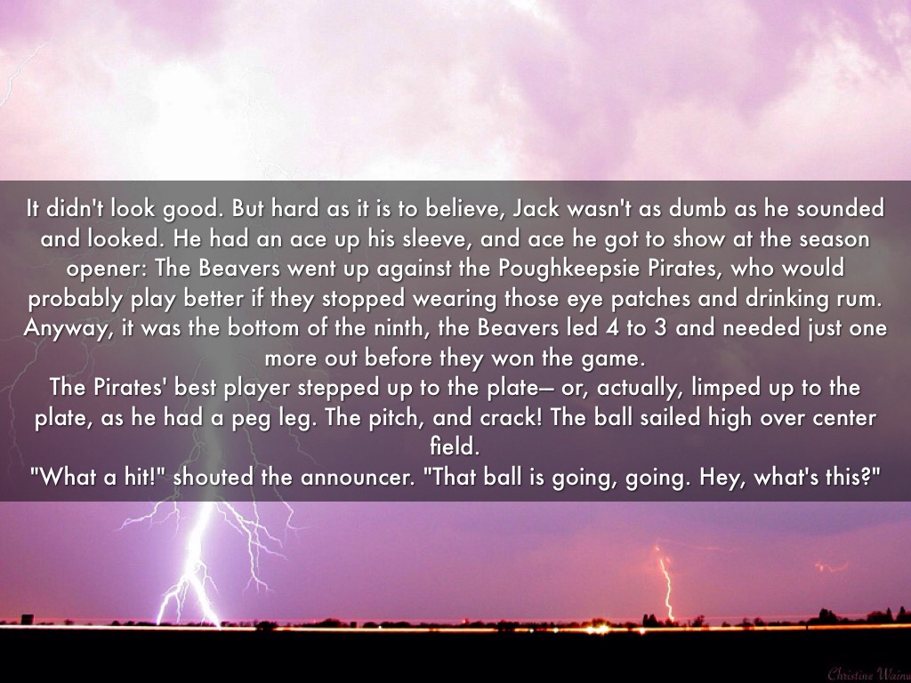 It didn't look good. But hard as it is to believe, Jack wasn't as dumb as he sounded and looked. He had an ace up his sleeve, and ace he got to show at the season opener: The Beavers went up against the Poughkeepsie Pirates, who would probably play better if they stopped wearing those eye patches and drinking rum. Anyway, it was the bottom of the ninth, the Beavers led 4 to 3 and needed just one more out before they won the game. The Pirates' best player stepped up to the plate--- or, actually, limped up to the plate, as he had a peg leg. The pitch, and crack! The ball sailed high over center field. "What a hit!" shouted the announcer. "That ball is going, going. Hey, what's this?"