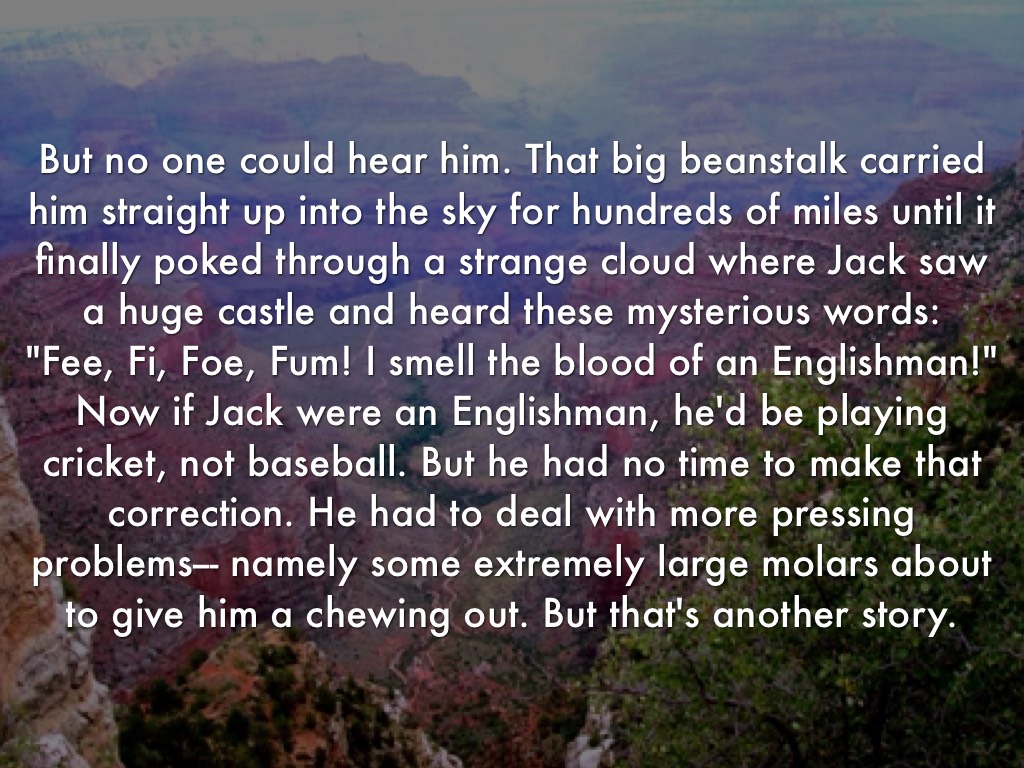 But no one could hear him. That big beanstalk carried him straight up into the sky for hundreds of miles until it finally poked through a strange cloud where Jack saw a huge castle and heard these mysterious words: "Fee, Fi, Foe, Fum! I smell the blood of an Englishman!" Now if Jack were an Englishman, he'd be playing cricket, not baseball. But he had no time to make that correction. He had to deal with more pressing problems--- namely some extremely large molars about to give him a chewing out. But that's another story.