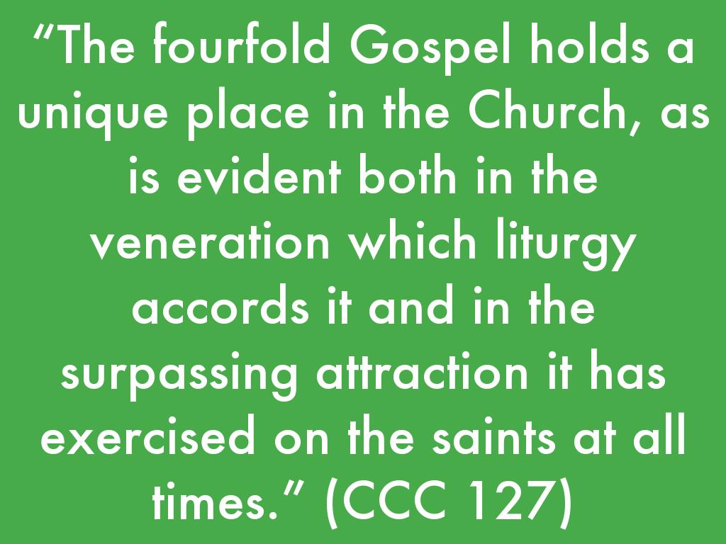 “The fourfold Gospel holds a unique place in the Church, as is evident both in the veneration which liturgy accords it and in the surpassing attraction it has exercised on the saints at all times.” (CCC 127)