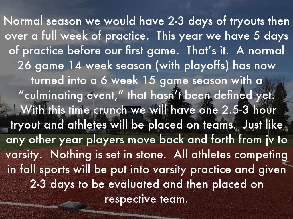 Normal season we would have 2-3 days of tryouts then over a full week of practice. This year we have 5 days of practice before our first game. That’s it. A normal 26 game 14 week season (with playoffs) has now turned into a 6 week 15 game season with a “culminating event,” that hasn’t been defined yet. With this time crunch we will have one 2.5-3 hour tryout and athletes will be placed on teams. Just like any other year players move back and forth from jv to varsity. Nothing is set in stone. All athletes competing in fall sports will be put into varsity practice and given 2-3 days to be evaluated and then placed on respective team.