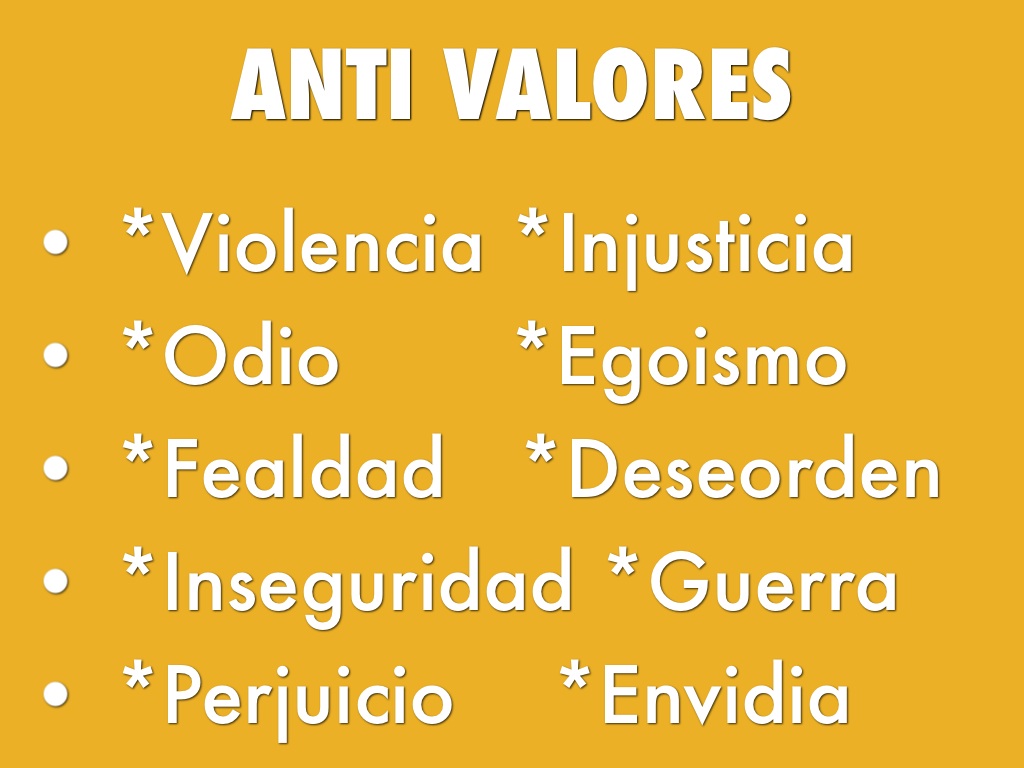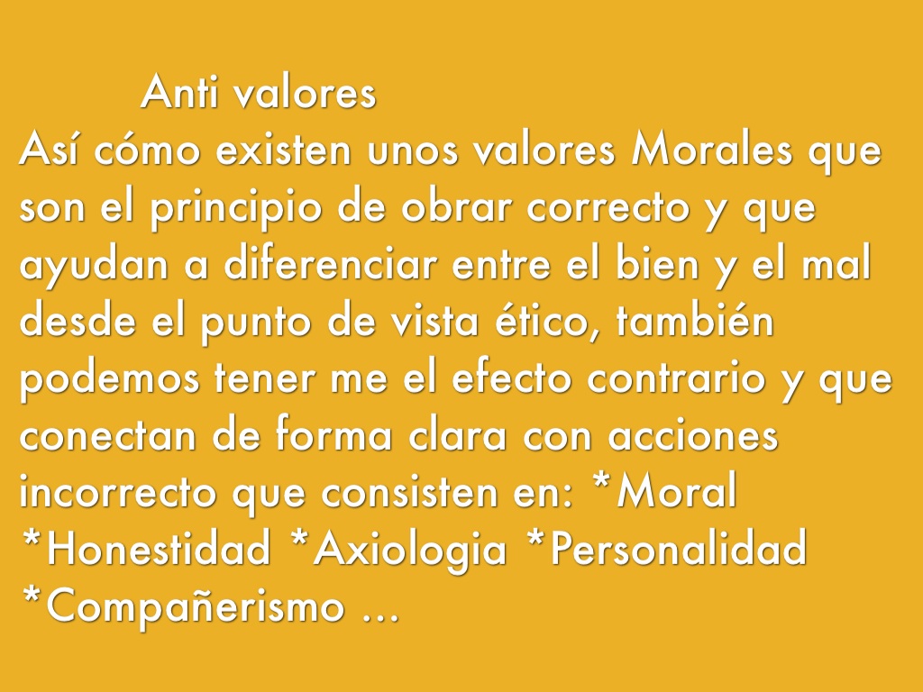Así cómo existen unos valores Morales que son el principio de obrar correcto y que ayudan a diferenciar entre el bien y el mal desde el punto de vista ético, también podemos tener me el efecto contrario y que conectan de forma clara con acciones incorrecto que consisten en: *Moral *Honestidad *Axiologia *Personalidad *Compañerismo