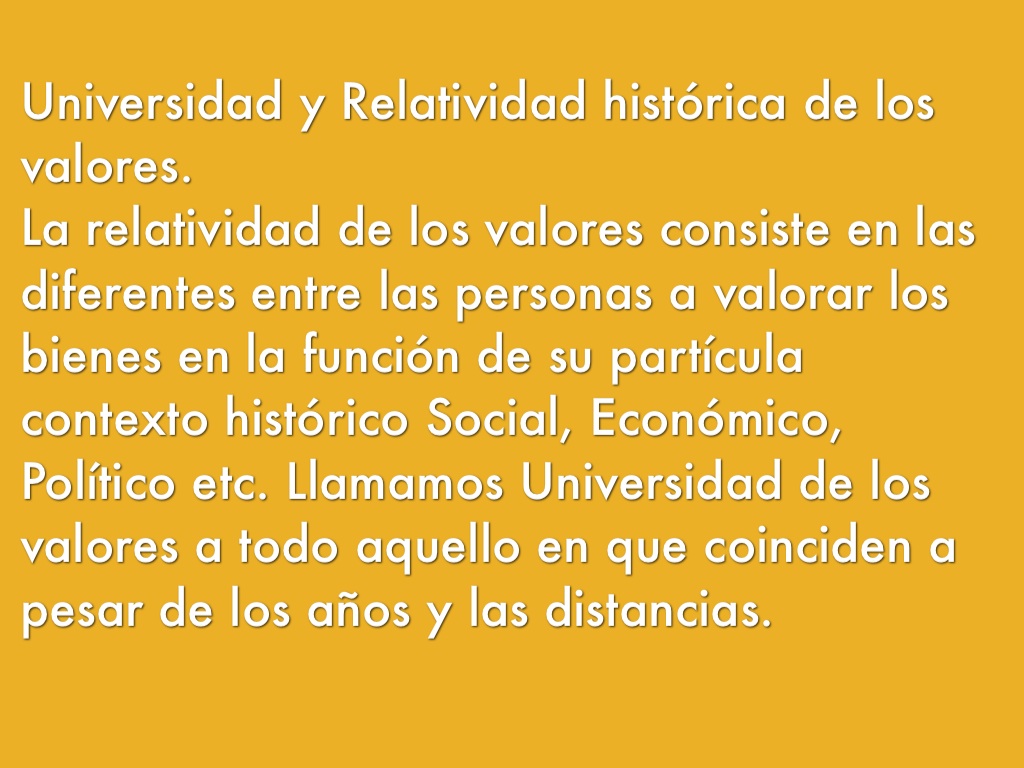 La relatividad de los valores consiste en las diferentes entre las personas a valorar los bienes en la función de su partícula contexto histórico Social, Económico, Político etc. Llamamos Universidad de los valores a todo aquello en que coinciden a pesar de los años y las distancias.