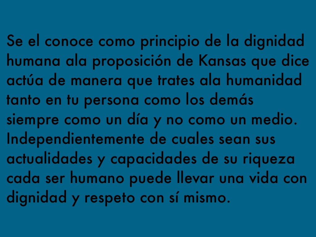 Se el conoce como principio de la dignidad humana ala proposición de Kansas que dice actúa de manera que trates ala humanidad tanto en tu persona como los demás siempre como un día y no como un medio. Independientemente de cuales sean sus actualidades y capacidades de su riqueza cada ser humano puede llevar una vida con dignidad y respeto con sí mismo.