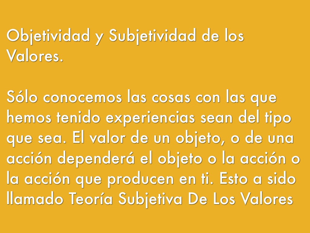 Sólo conocemos las cosas con las que hemos tenido experiencias sean del tipo que sea. El valor de un objeto, o de una acción dependerá el objeto o la acción o la acción que producen en ti. Esto a sido llamado Teoría Subjetiva De Los Valores