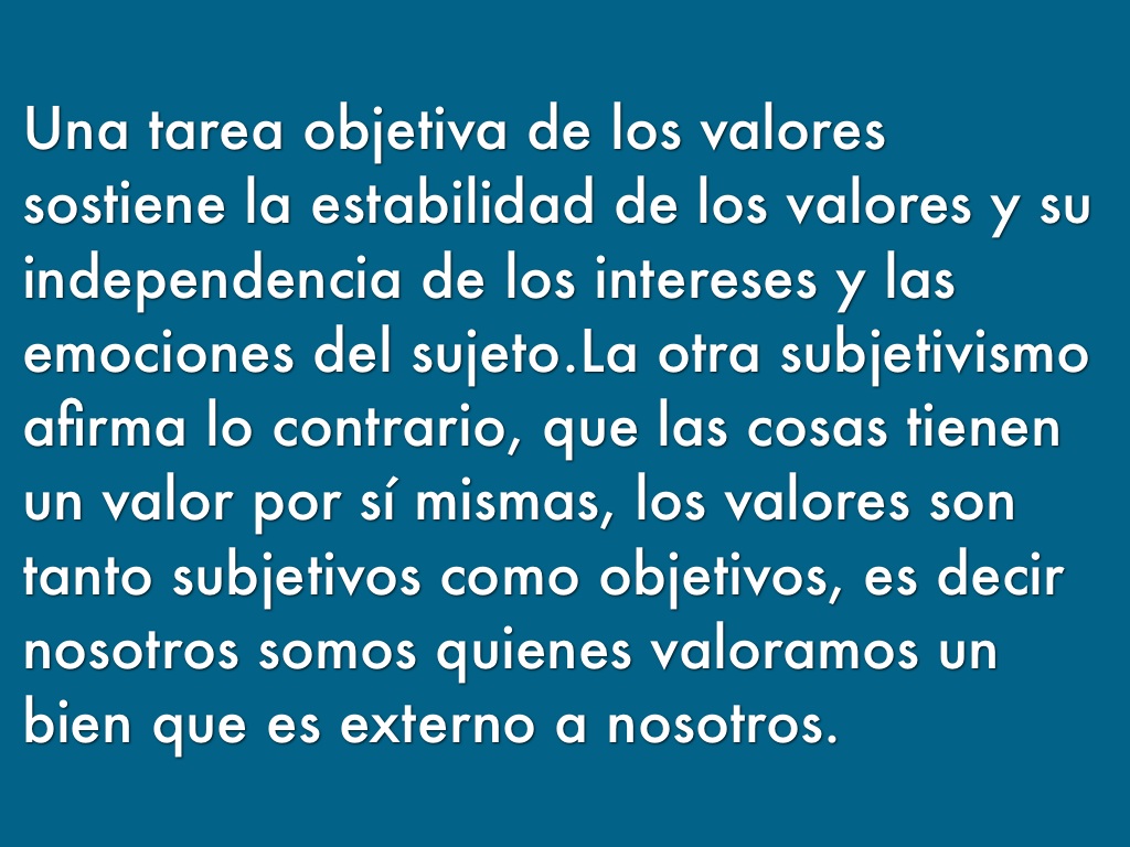 Una tarea objetiva de los valores sostiene la estabilidad de los valores y su independencia de los intereses y las emociones del sujeto.La otra subjetivismo afirma lo contrario, que las cosas tienen un valor por sí mismas, los valores son tanto subjetivos como objetivos, es decir nosotros somos quienes valoramos un bien que es externo a nosotros.