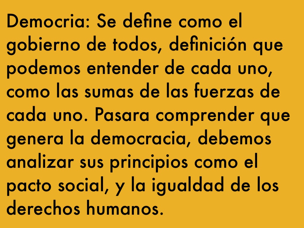 Democria: Se define como el gobierno de todos, definición que podemos entender de cada uno, como las sumas de las fuerzas de cada uno. Pasara comprender que genera la democracia, debemos analizar sus principios como el pacto social, y la igualdad de los derechos humanos.