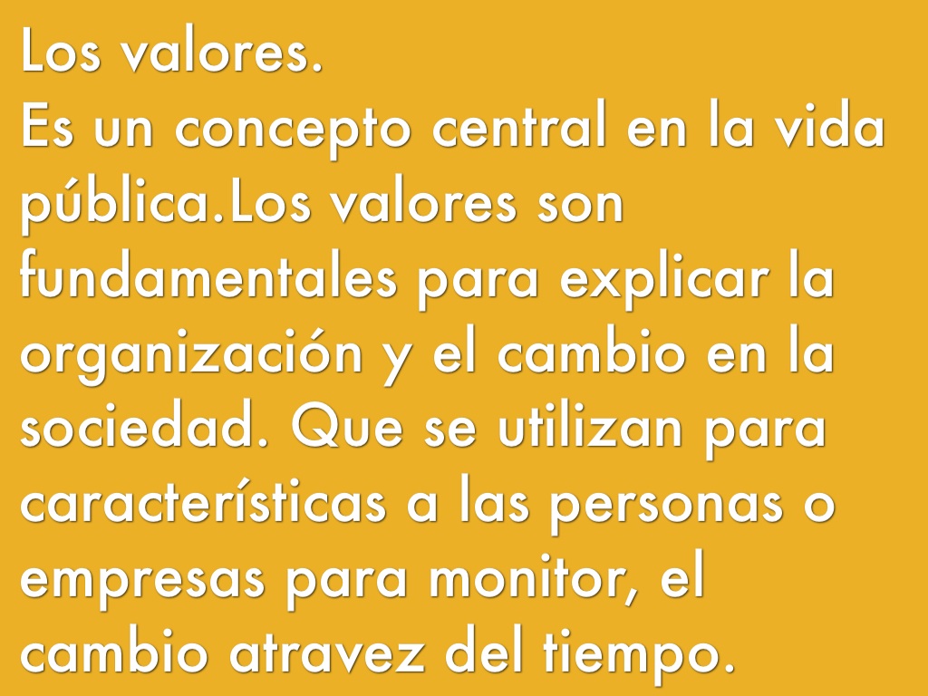 Es un concepto central en la vida pública.Los valores son fundamentales para explicar la organización y el cambio en la sociedad. Que se utilizan para características a las personas o empresas para monitor, el cambio atravez del tiempo.
