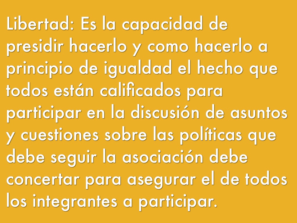 Libertad: Es la capacidad de presidir hacerlo y como hacerlo a principio de igualdad el hecho que todos están calificados para participar en la discusión de asuntos y cuestiones sobre las políticas que debe seguir la asociación debe concertar para asegurar el de todos los integrantes a participar.