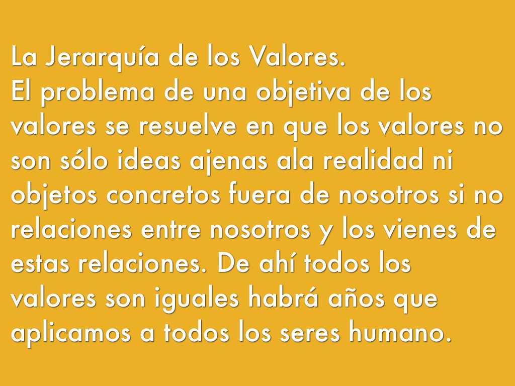El problema de una objetiva de los valores se resuelve en que los valores no son sólo ideas ajenas ala realidad ni objetos concretos fuera de nosotros si no relaciones entre nosotros y los vienes de estas relaciones. De ahí todos los valores son iguales habrá años que aplicamos a todos los seres humano.
