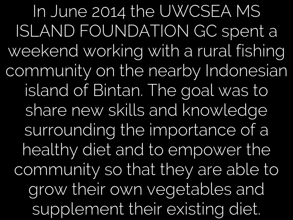 In June 2014 the UWCSEA MS ISLAND FOUNDATION GC spent a weekend working with a rural fishing community on the nearby Indonesian island of Bintan. The goal was to share new skills and knowledge surrounding the importance of a healthy diet and to empower the community so that they are able to grow their own vegetables and supplement their existing diet.