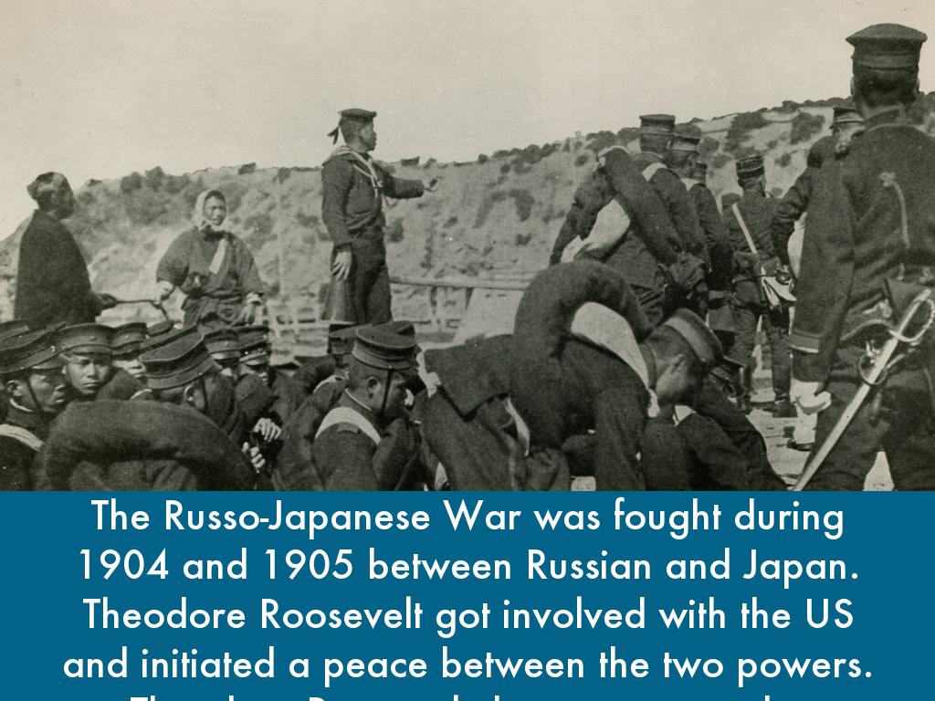 The Russo-Japanese War was fought during 1904 and 1905 between Russian and Japan. Theodore Roosevelt got involved with the US and initiated a peace between the two powers. Theodore Roosevelt than went on to be rewarded a Nobel Prize.