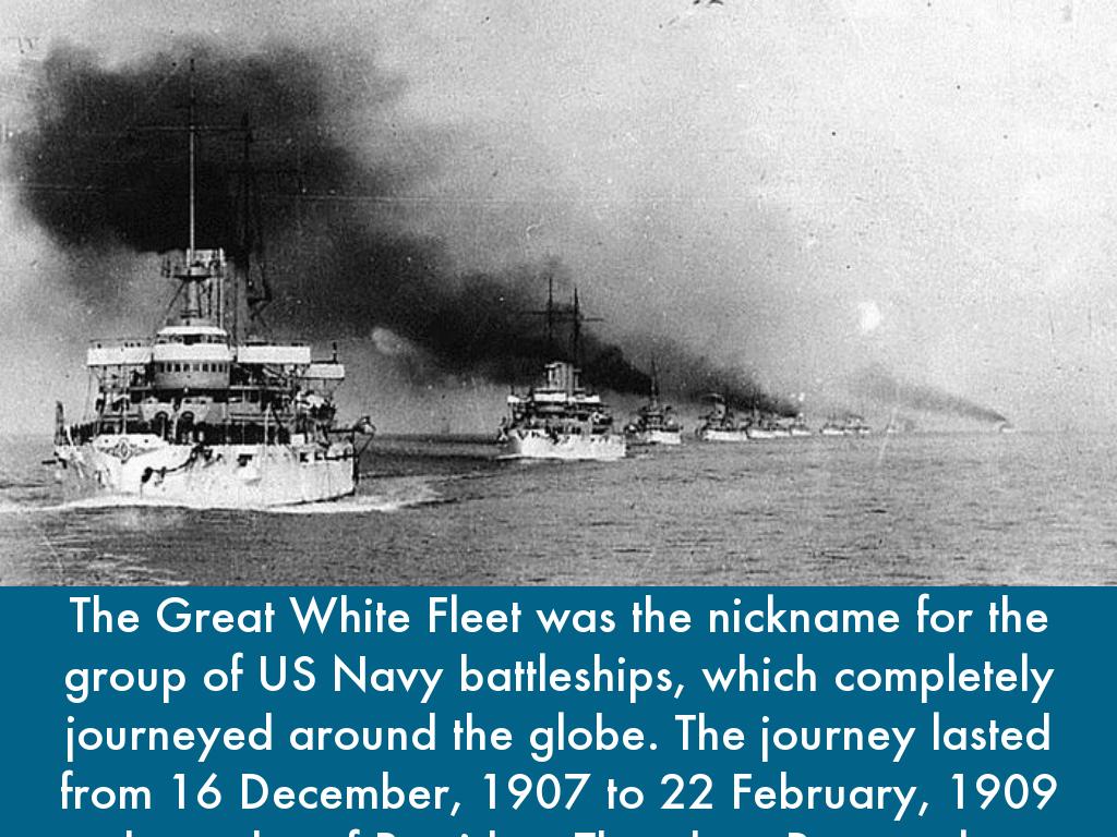 The Great White Fleet was the nickname for the group of US Navy battleships, which completely journeyed around the globe. The journey lasted from 16 December, 1907 to 22 February, 1909 by order of President Theodore Roosevelt.