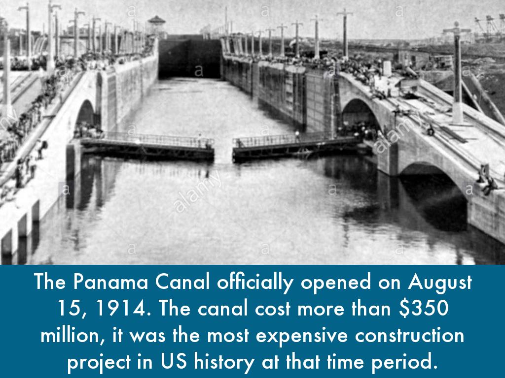 The Panama Canal officially opened on August 15, 1914. The canal cost more than $350 million, it was the most expensive construction project in US history at that time period.