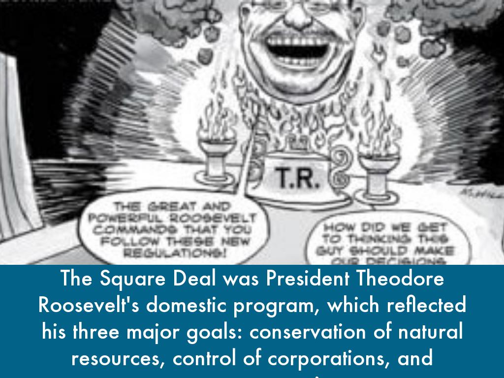 The Square Deal was President Theodore Roosevelt's domestic program, which reflected his three major goals: conservation of natural resources, control of corporations, and consumer protection.